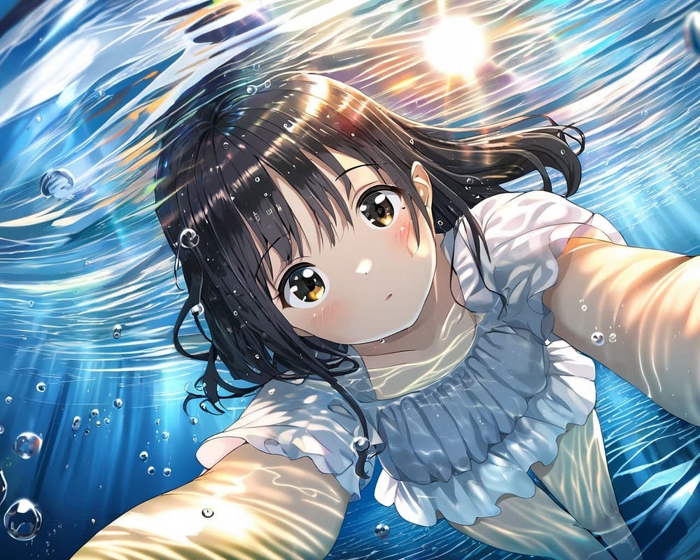 (selfie:1.5), (wide angle view:1.5) of 1girl, black hair, air bubble, floating in water, underwater ripples, sun shine