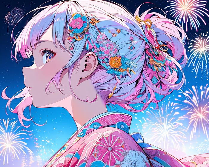 (from below:1.3), (profile:1.5) of a girl wearing a pink kimono, looking at viewer, firework in the sky, intricate detailed