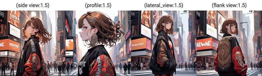 side view,lateral viewandflank viewoffer random left/right side angles.profileandside viewwith the character appearing more elegant in profile shots.