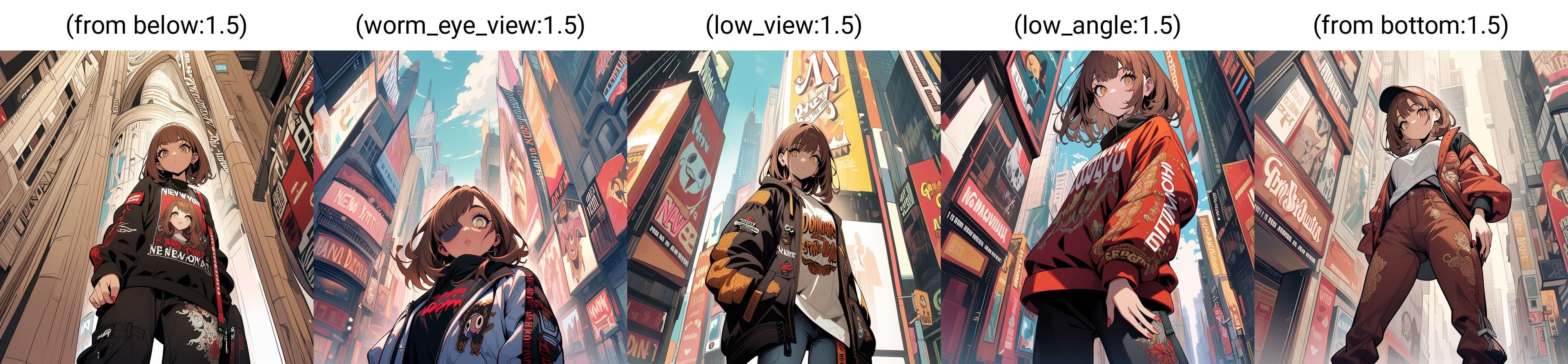 low_angle,low_viewslightly lower the perspective.worm_eye_viewmay inadvertently introduce bug-like patterns, distorting eyes into goggles or compound eyes.from bottomviews occasionally include the buttocks.