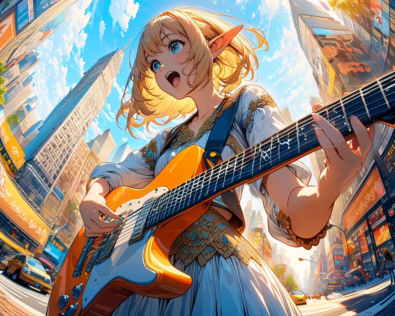 (close up shot:1.5) of a beautiful the cloud elf queen busks on the streets, (wide angle view:1.3) of new york, playing guitar and singing, dynamic pose, highly detailed, smooth, sharp focus, intricate detailed