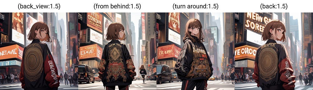 back view,from behindorbackdepict the majority of the back.Turn aroundsignify a shift in perspective.