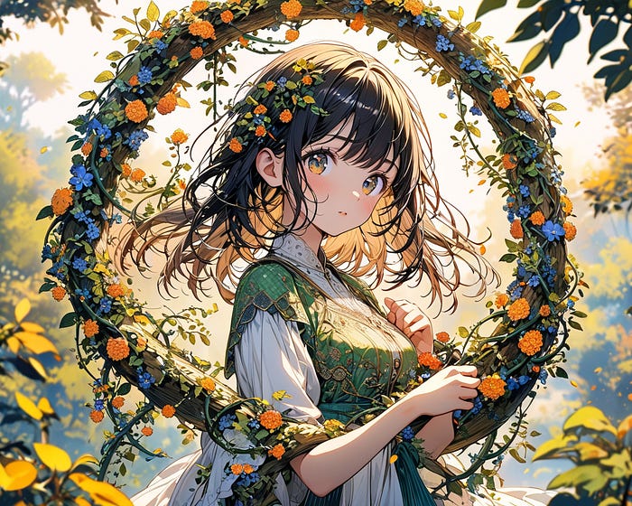 (side view:1.5), (medium shot:1.5) of a girl hold on to the tree vine, tree from which the foliage is flying around, motion_blur background, intricate detailed, looking at viewer